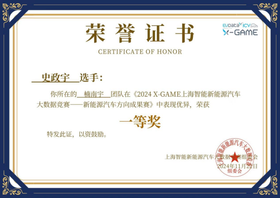 2024年11月22日,第七届X-GAME上海智能新能源汽车大数据竞赛决赛圆满落幕,公司员工史政宇所在的“楠南宇队”获新能源汽车方向成果赛一等奖(第一名)。
