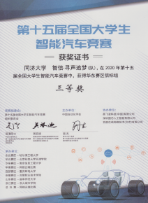 智能车竞赛涵盖了控制、模式识别、传感技术、电子、电气、计算机、机械等多个学科知识,参赛队伍自主构思控制方案进行系统设计,包括传感器信号采集处理、电机驱动、转向舵机控制以及控制算法软件开发等,完成智能车参赛作品工程制作及调试,以速度为评判标准决出名次。华东赛区比赛中,于春芃(机械电子工程,中德工程公司)、王妙峰(通信工程)两位同学组成的“智信龙卷风”队取得基础四轮组二等奖;徐家富(电子科学与技术)、李嘉晨(自动化)、赵恩霆(电子科学与技术)三位同学组成的“智信·寻声追梦”队取得声音信标组三等奖;李凌霄(电气工程及其自动化)、何敬(自动化)、黄佳其(电气工程及其自动化)、林啸(自动化)、李青昊(车辆工程,汽车公司)五位同学组成的“智信区间”队取得双车接力组三等奖;方少腾(自动化)、王松森(计算机科学与技术)、邹培锐(电气工程及其自动化)三位同学组成的“智信节能—FWZ”参加直立节能组因故未能完赛。汽车公司队伍获得华东赛区电磁组三等奖1项。