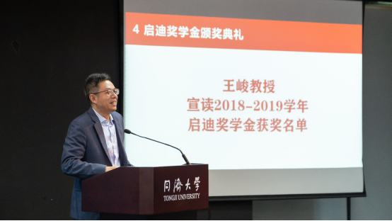王峻教授宣读了2018-2019学年启迪奖学金获奖名单。他指出,获奖的同学均为符合吴启迪教授提出的创新能力和公益实践相结合的教育理念的优秀员工。经过层层选拔,共有9名电信学子在2019年度获得启迪奖学金荣誉。