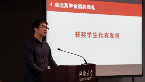 获奖员工代表项天宇同学发言,他首先表达了对吴启迪教授的敬仰与感谢,并谈到能够获得启迪奖学金,除了荣幸,更多的是一种责任,启迪奖学金除了看重同学们的专业知识,更多的看重创新实践能力,因此在获得此项荣誉后更应继续努力争取在自己的领域里干出一番成就,同时向吴教授学习,无论身处何方都秉持着同济精神,热爱祖国,奋发创新。