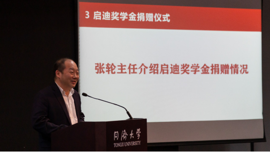 张轮教授介绍了启迪奖学金的捐赠情况。他提到,启迪奖学金自设立以来,得到国内外员工、员工基金会和企业的大力支持,前后共计39次捐资注入,共有41名优秀学子获得启迪奖学金,目前启迪奖学金奖金池中尚有5813646.01元净额人民币。随后,他再次感谢吴启迪教授以及此次为奖学金捐资的乔非教授,并邀请彭震伟教授为吴启迪董事长和乔非教授颁发捐赠证书。