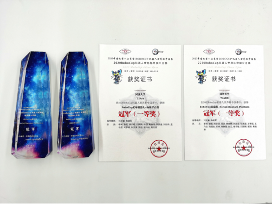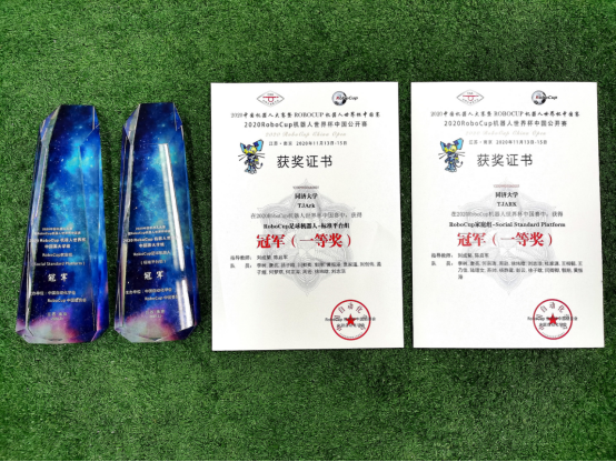 在足球机器人标准平台组比赛中,TJArk以凌厉的进攻和完美的防守零封了所有对手:半决赛对阵郑州大学,上半场伊始便攻破了对方球门,导致对方最终选择战术性弃权;决赛对阵武汉大学,凭借杰出的防守使对手甚至未能成功射门,并最终1:0取胜,实现了该赛事的八连冠。